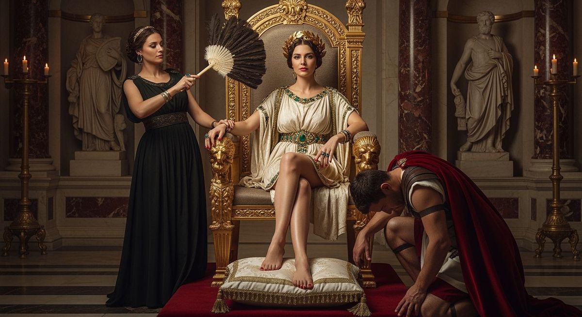This image depicts a regal Roman Empress seated on a golden throne in a lavish palace. The scene evokes a photorealistic aesthetic with soft lighting and intricate details, reminiscent of classical art.
