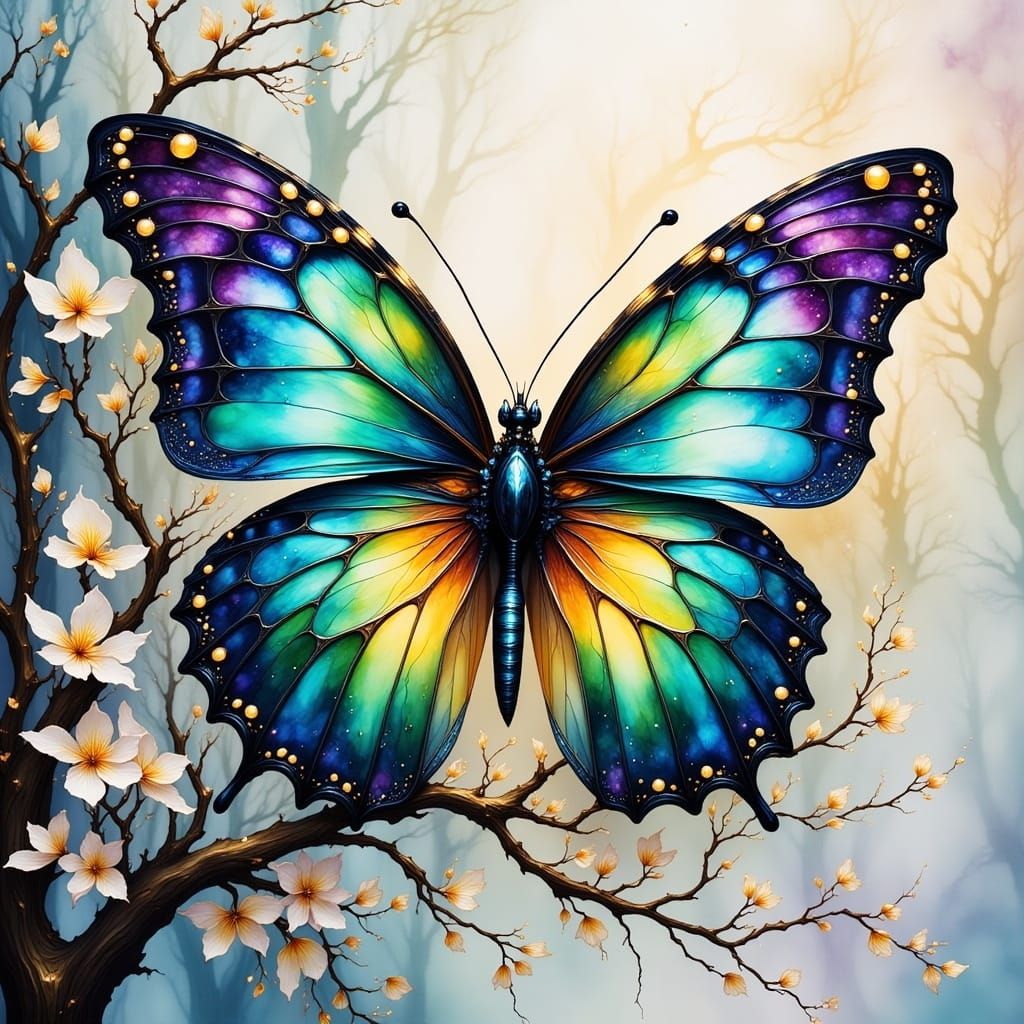 This image showcases a vibrant butterfly with iridescent blue, green, purple, and yellow wings resting on a blossoming branch. The artwork features swirling colors and intricate details in a dreamy, alcohol-ink aesthetic.