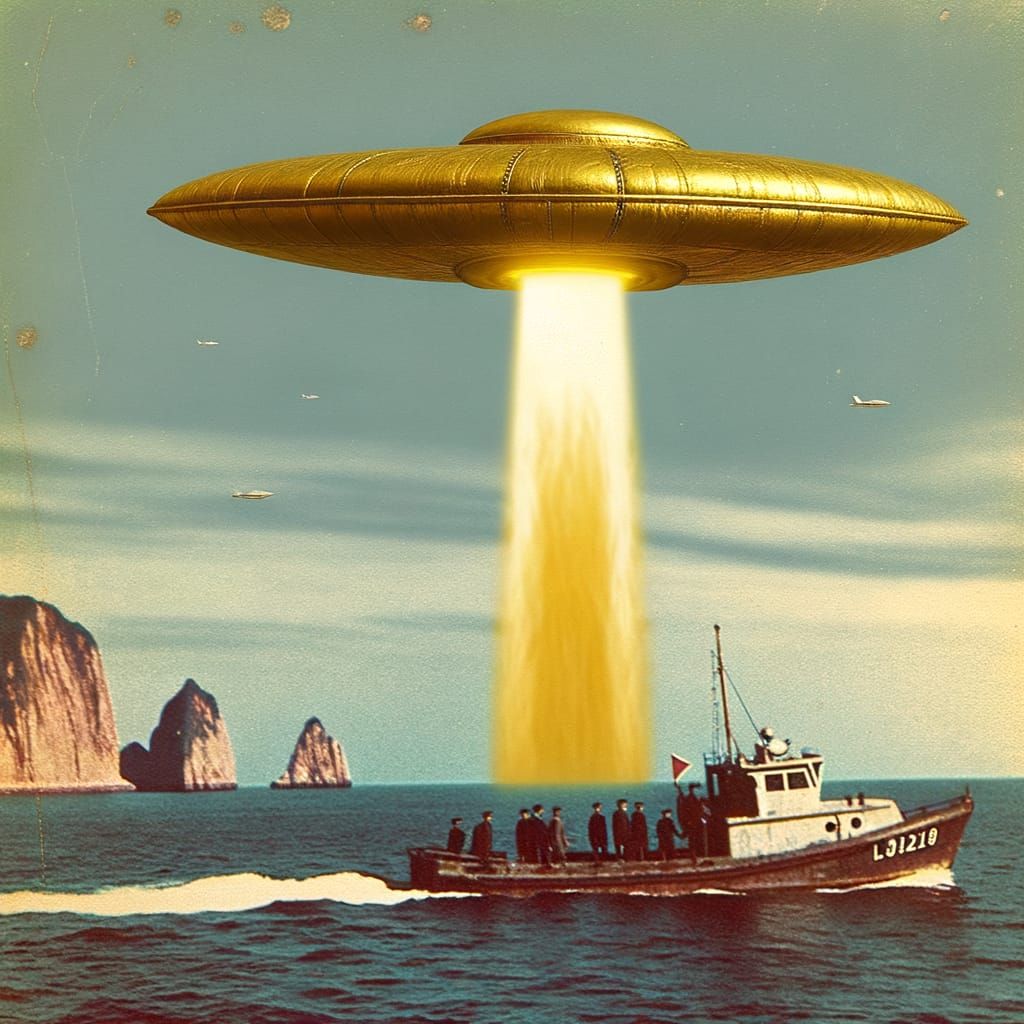 Display a realistic photo of this 1968 incident, over Lüshun Port, Liaoning Province, China: a gold, luminous, oval-shaped object flew alongside a coast guard boat in
