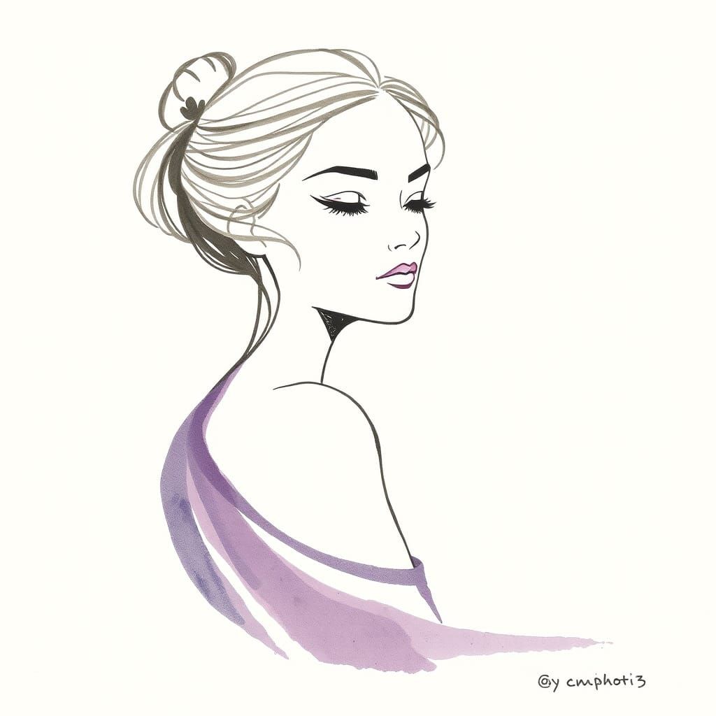 This image shows a minimalist one-line artwork embodying feminine beauty. Elegant brush strokes in watercolor and ink create a sumi-e style image with amethyst and sand shades.