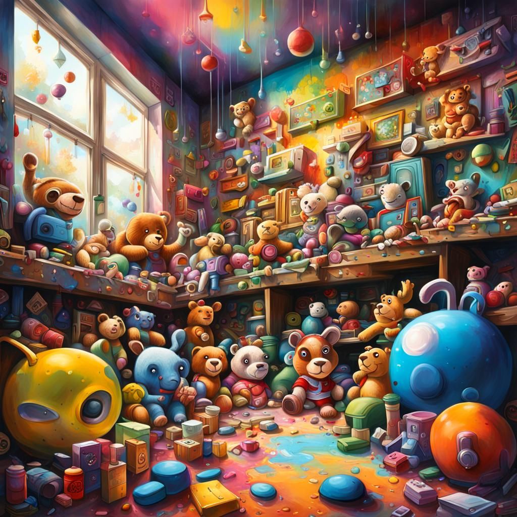 This image shows a playroom overwhelmed with toys, rendered in a vibrant graffiti art style. The artwork features high contrast and polychromatic colors, with ultra-detailed elements.