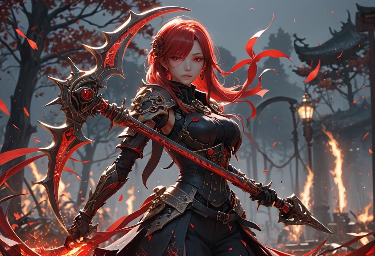A digital art image showing a fantasy weapon with a red aura. The aesthetic is inspired by 3D anime art and concept art, rendered in extremely detailed 8k resolution.