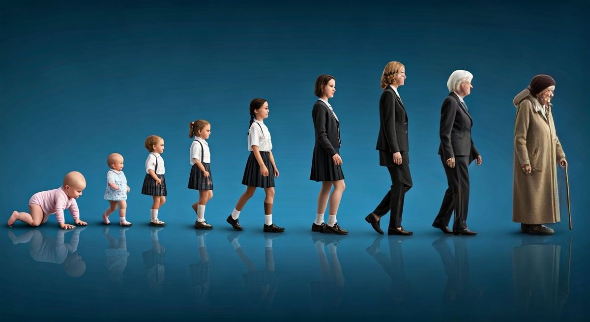 This photorealistic image depicts the life stages of a Swedish woman, from infancy to old age, walking progressively to the right. The background reflects evolving eras.