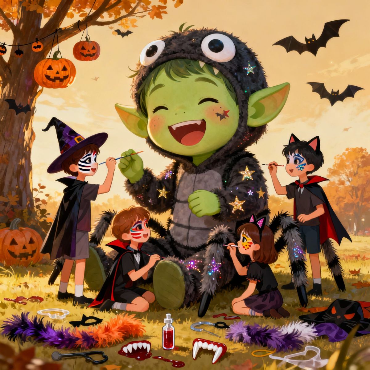 This image depicts a young ogre happily joining human children for Halloween festivities, sharing laughter and applying makeup while in costume.