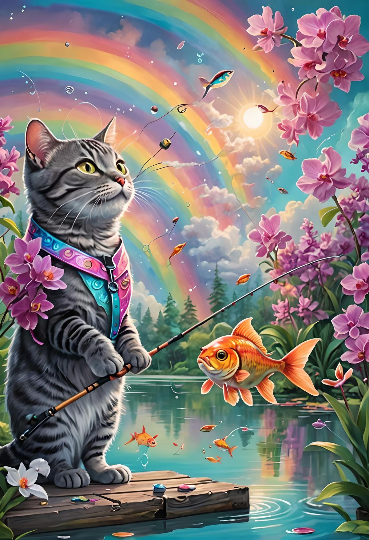 A gray tabby cat standing on the dock of a reflective lake, holding a fishing pole, catching a cute smiling fish. A large wide rainbow stretches across the sky in shades of PASTEL MAGENTA, PASTEL TURQUOISE, AND PASTEL ORANGE color scheme. A large heart shape floating in the sky with psychedelic swirly ...