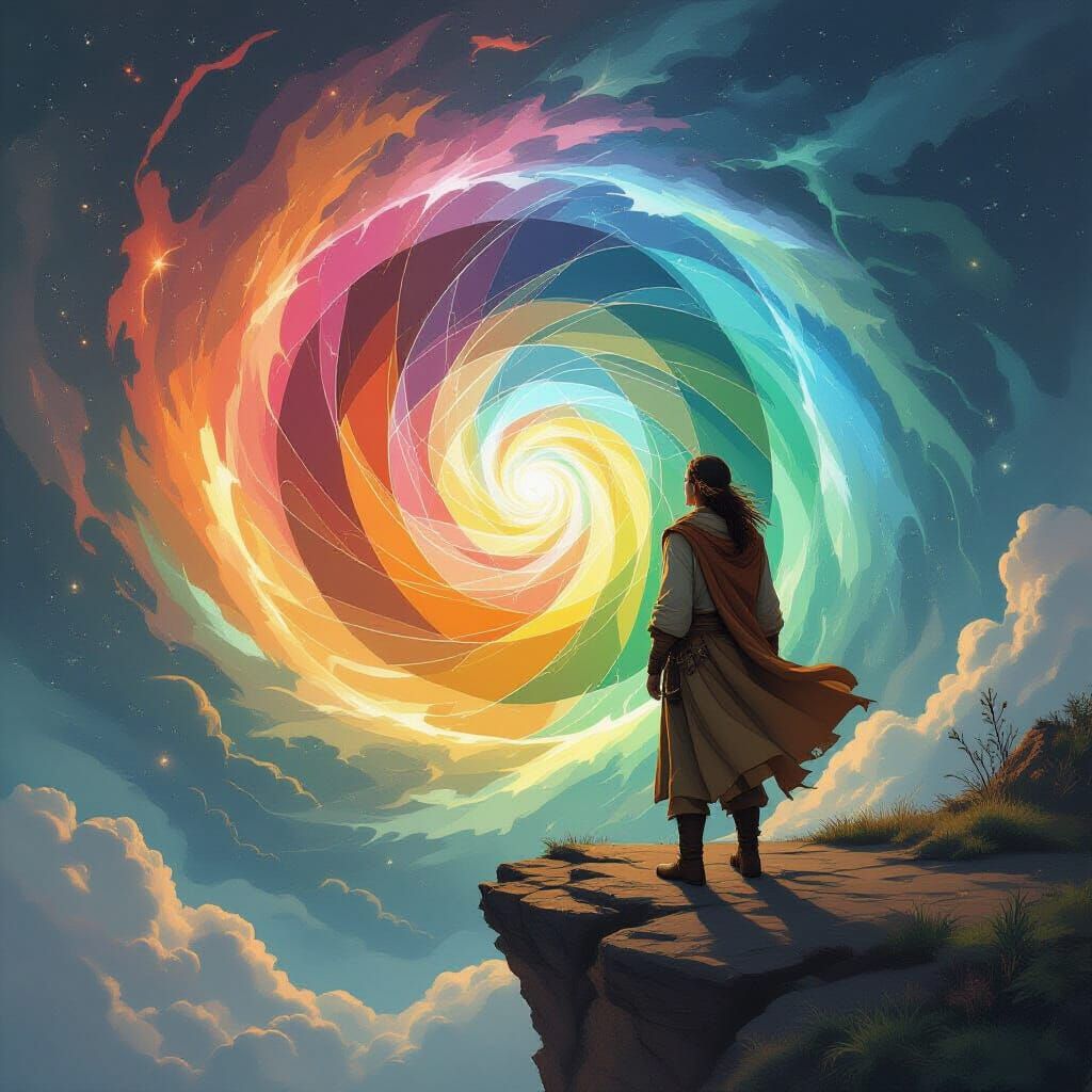 A figure stands before a swirling, colorful vortex, dressed in earth tones, embodying adventure and curiosity. The image blends spiritual symbolism and digital mysticism with expressive brushwork.