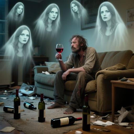 This image shows a disheveled man slumped on a couch, staring at a glass of red wine. Ghostly faces of a woman surround him, their eyes averted, in a somber, artful composition.