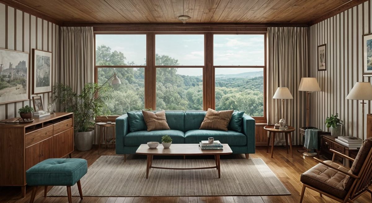 This image showcases a serene and elegant scene, reminiscent of mid-century modern design, with a focus on quiet luxury and commercial romanticism. The artwork features a sophisticated aesthetic, characteristic of the era's visual identity.
