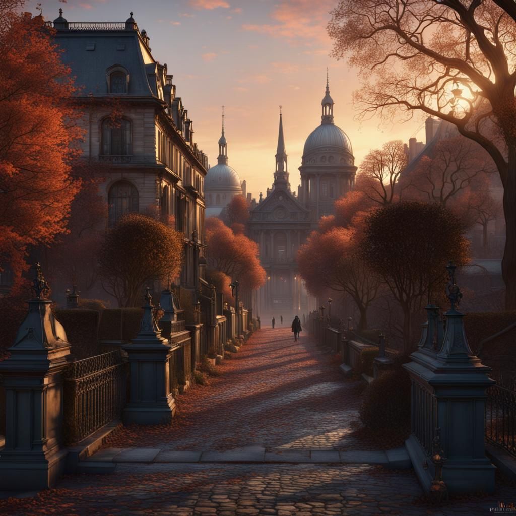 A detailed matte painting of a Belle Epoque stroll through Pere Lachaise cemetery at sunset. The image features deep colors and intricate details in a fantastical, complementary color scheme.