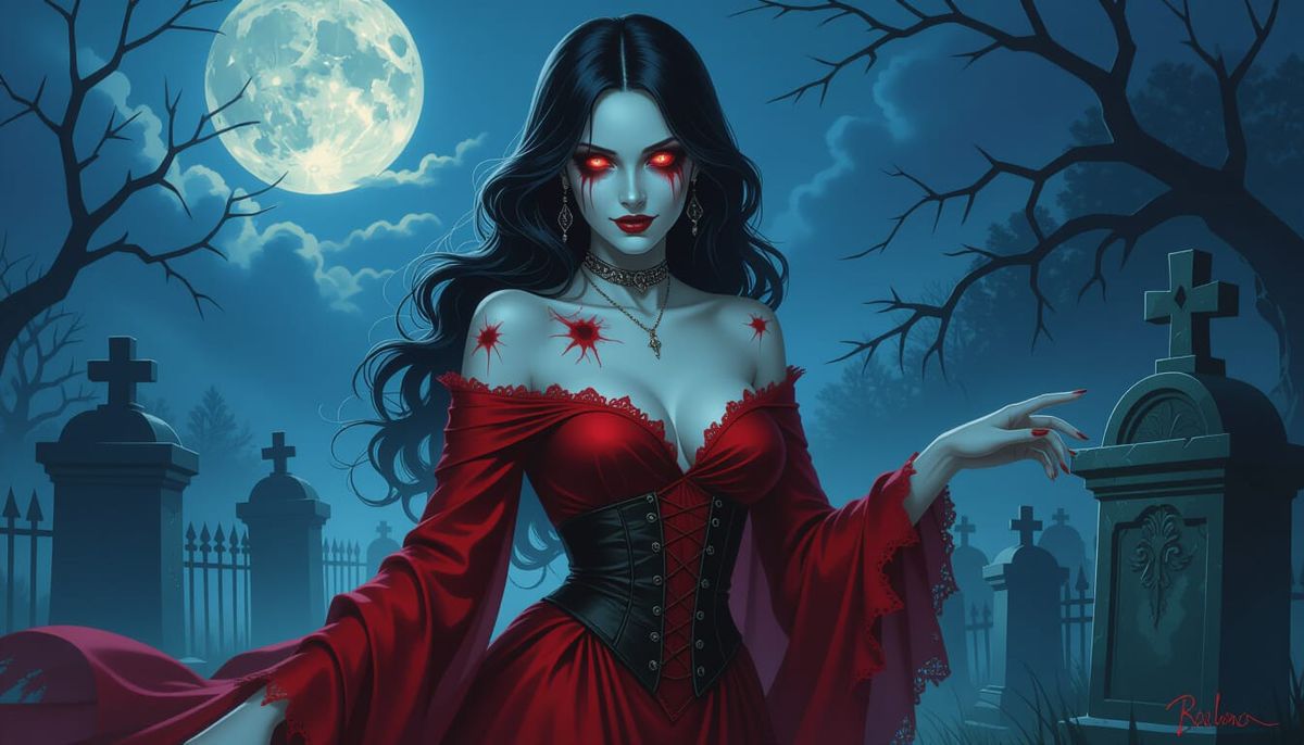This image depicts a beautiful zombie woman in tattered crimson silk, gliding through a moonlit graveyard. Her eyes glow crimson, and she possesses an otherworldly grace, painted in a dark fantasy style with dramatic lighting.