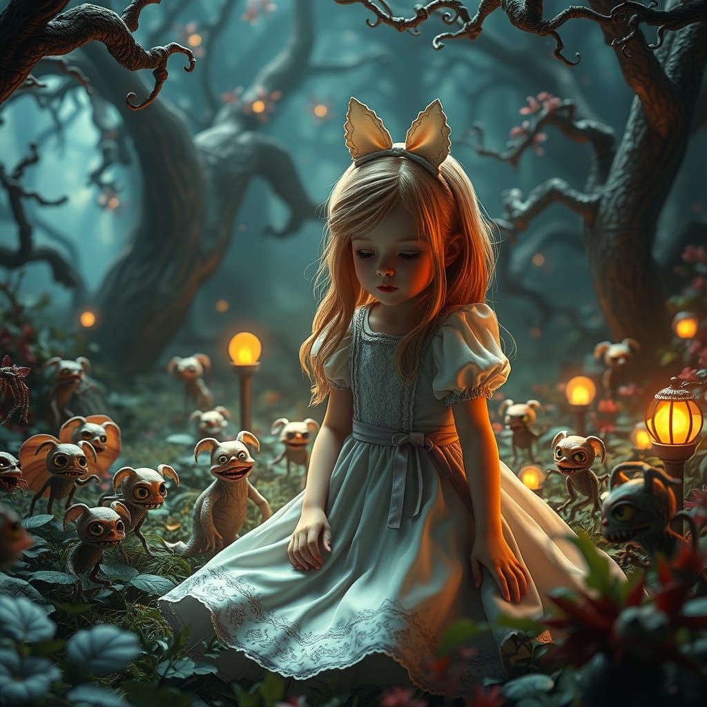 A surreal image of a young girl in a bizarre garden being observed by small monsters. The image has a highly detailed, fantastical aesthetic with complementary colors.