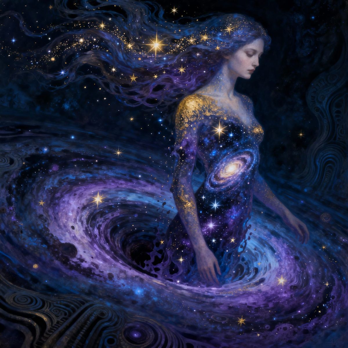 This image shows an ethereal woman whose stardust hair dissolves into a cosmic vortex, symbolizing rebirth with new galaxies forming within. It features a surreal, dark fantasy style with deep blues, purples, and golds.
