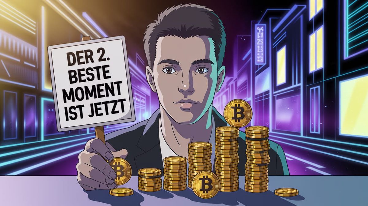 This image features a stunning portrait of Bitcoin coins and a sign with the letters 'Der 2. beste Moment ist jetzt', set against a vibrant, stylized cityscape with glowing neon lights, creating a captivating and anime-inspired scene.