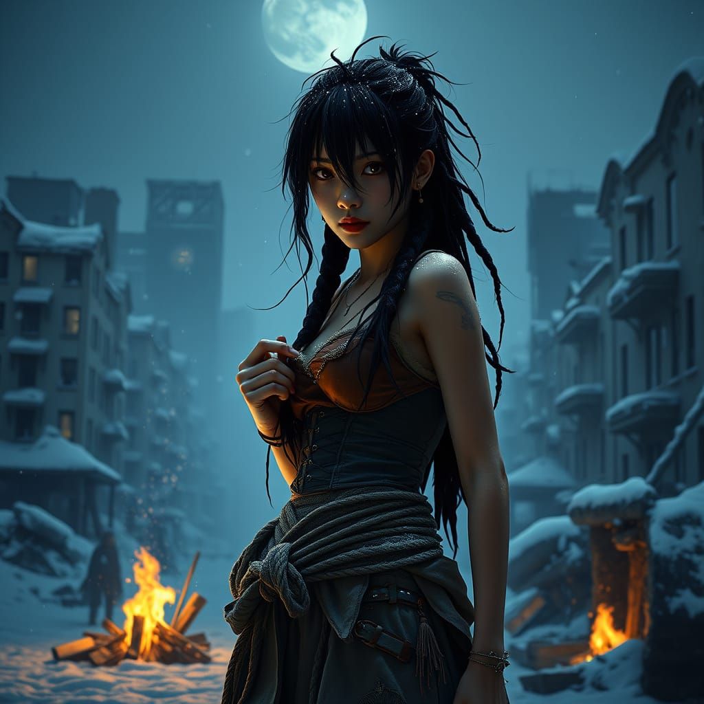 A striking picture of a cyberpunk woman in a snow-covered, dystopian city. She huddles near a small fire, holding a glowing object, her determined gaze conveying resilience in the desolate landscape.