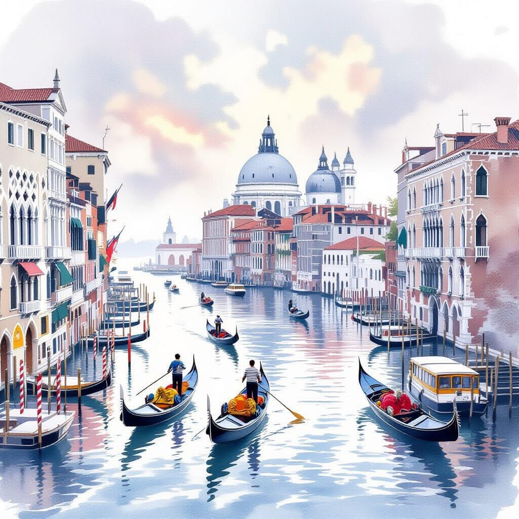 This image shows Venice's Grand Canal harbor in the early morning mist. Gondoliers navigate water taxis near historic palazzos, all rendered as a traditional watercolor painting with soft color washes.