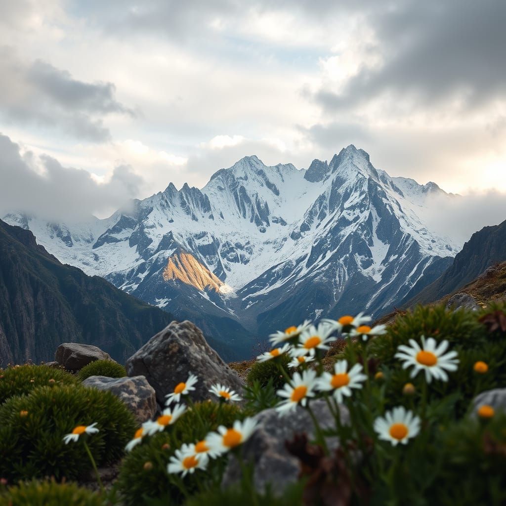 A scenic view of snow-capped mountains under a dramatic sky, reminiscent of classic landscape photography. The foreground features wildflowers and weathered rocks under soft lighting, in a style that evokes a peaceful, serene mood.