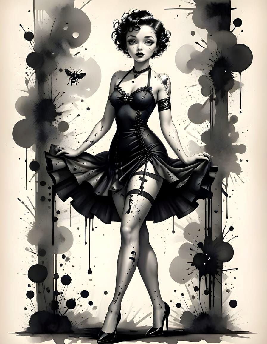 This image features Betty Boop in a medium shot, rendered as a high-contrast black and white ink wash painting with vibrant splatters. Art Deco details adorn her classic dress and accessories.