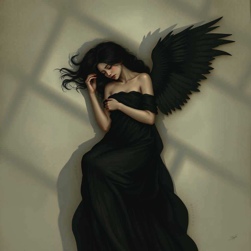 A serene woman with dark hair and wings sleeps peacefully, surrounded by soft, moonlit shadows, in a dreamy, muted color palette with delicate textures.