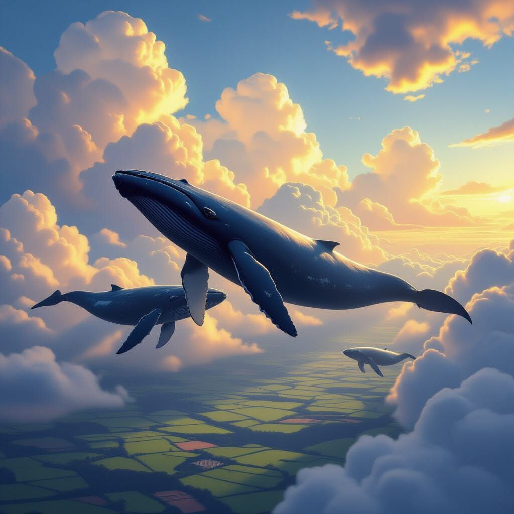 This hyperrealistic digital painting shows colossal whales floating through golden hour clouds, casting shadows on fields below. The scene evokes awe with dramatic lighting and an ethereal glow.