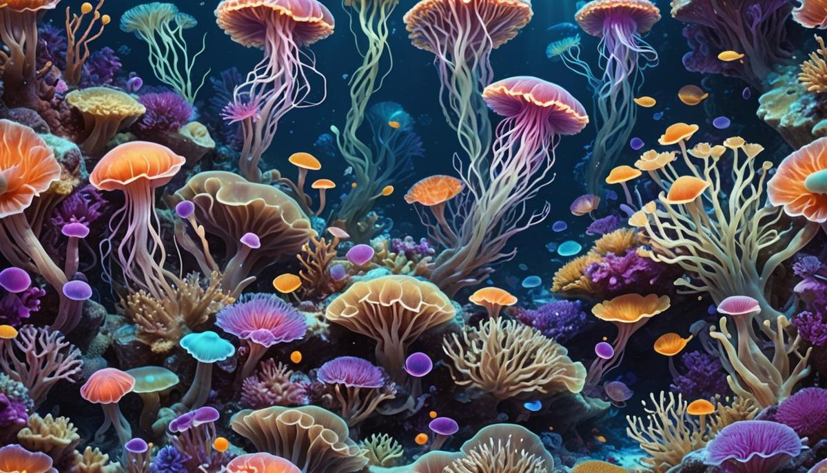 A striking picture of a vibrant coral reef teeming with marine life. Bioluminescent jellyfish drift through the water, which is illuminated with blue and purple hues. This digital art features detailed textures and soft focus.
