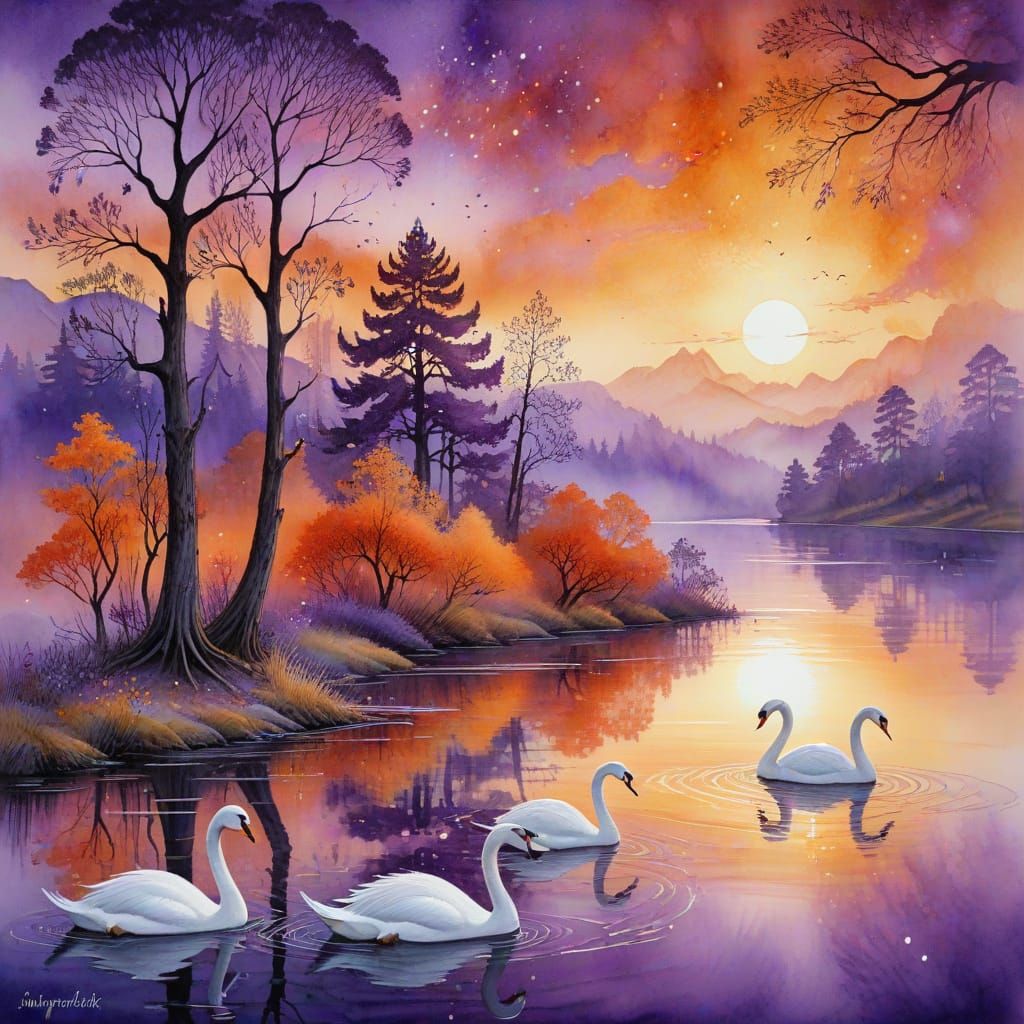 This enchanting image captures a serene lake scene at dusk, with swans gliding effortlessly across the water, set against a backdrop of trees shrouded in a warm, golden haze. The artwork combines the dreamy qualities of watercolor with the vibrant colors of alcohol ink, evoking the mystical styles of Kay...