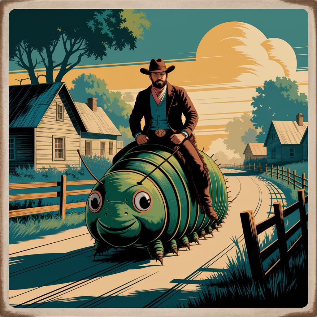 This image depicts a vintage-style scene of a rugged cowboy riding a massive green caterpillar along a sun-drenched country road, set against a backdrop of quaint farmhouses and rolling hills, evoking a sense of whimsy and charm.