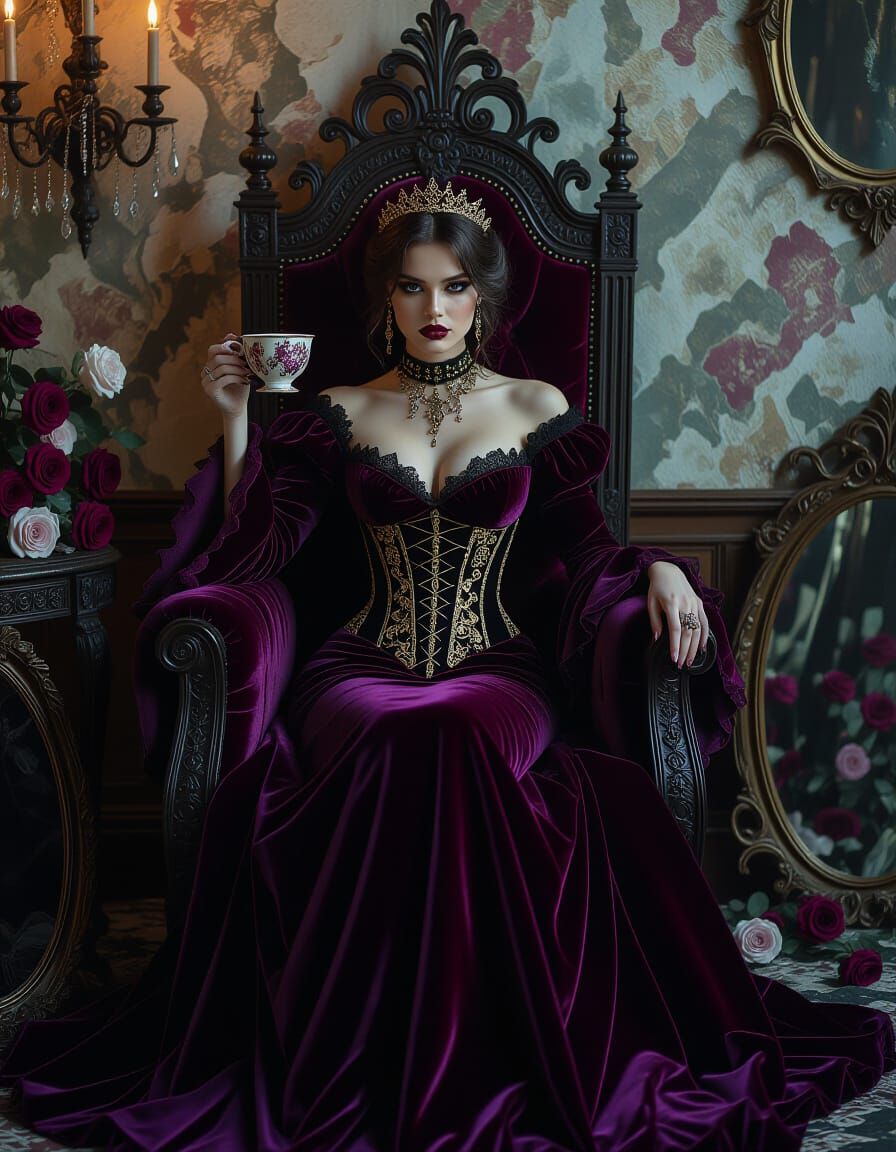 A dramatic image of a gothic woman on a throne of thorns. The scene features baroque elements and bruised elegance, rendered with high-detail textures and cinematic lighting.