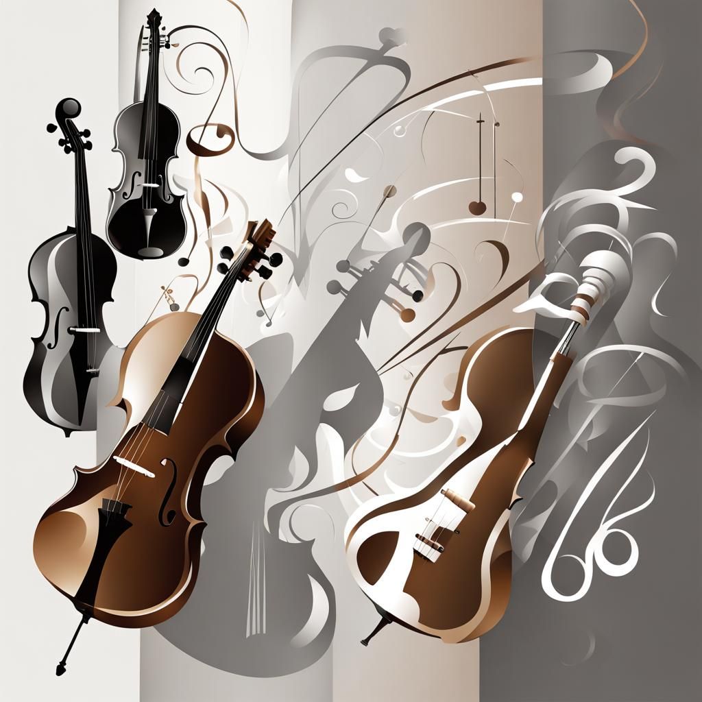 A captivating image showcasing silhouettes of musical instruments against a soft gradient backdrop. This detailed matte painting features abstract elements and shadow play in complementary colors, creating a fantastical concept art piece.
