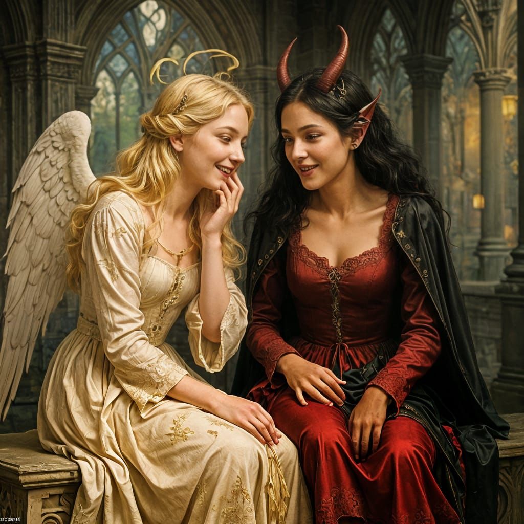 A captivating image showing an angelic blonde and devilish brunette sharing secrets on a gothic bench. Volumetric lighting and a bokeh effect enhance the rich fabrics, intricate details, and tetradic colors.