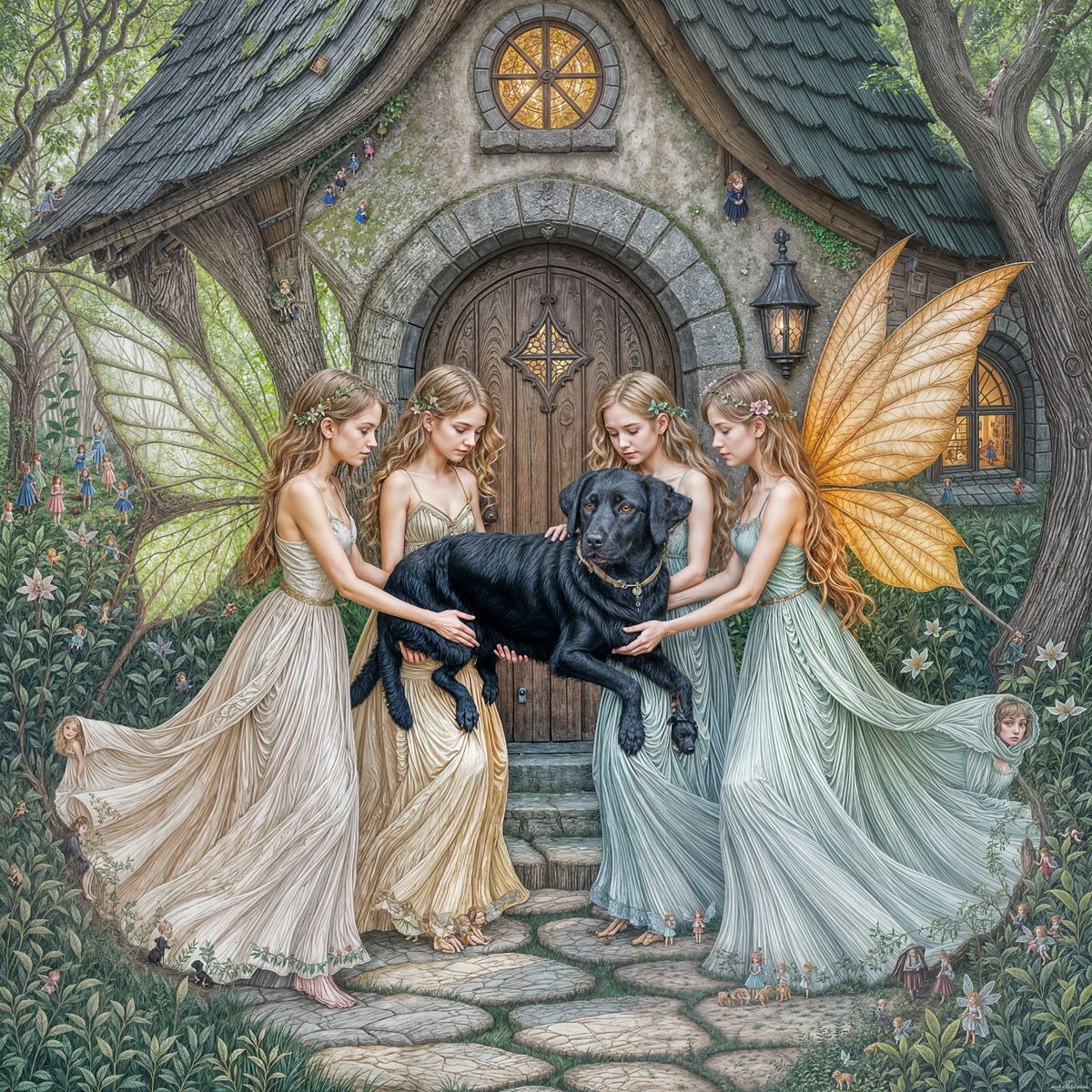 A heartwarming image shows five miniature fairies assisting a sick black Labrador at a wizard's cottage entrance. The scene evokes a sense of magic and compassion within a woodland setting.