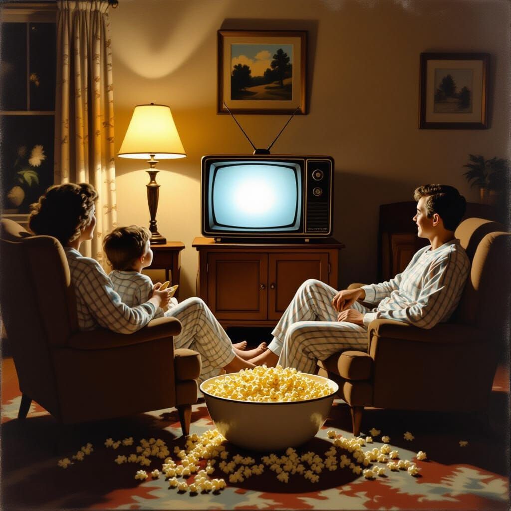 This image depicts a family from the 1960s watching TV together in their living room. The scene is reminiscent of classic American illustration, with muted colors and a grainy, nostalgic texture.