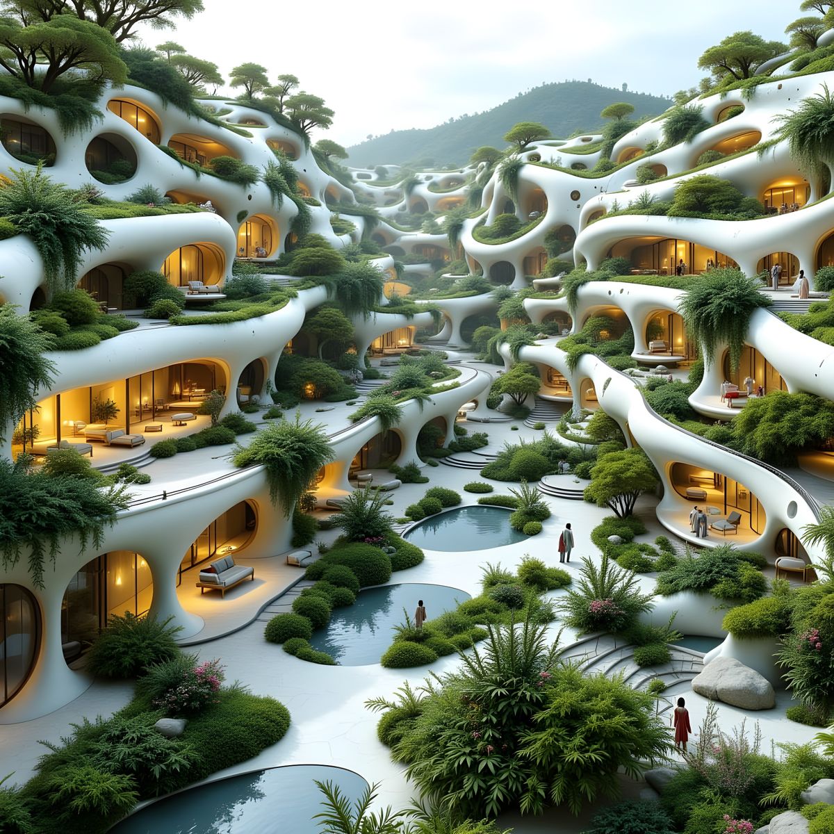 This image shows a futuristic ecovillage with sleek, white architecture blending harmoniously with lush vertical gardens and curved solar panels. Soft ambient lighting illuminates the scene, creating a sense of serenity and harmony between nature and technology.