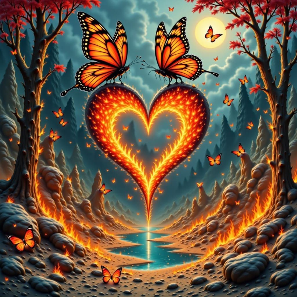 This illustration features a vibrant, heart-shaped portrait against a dynamic landscape of red and orange flames. Butterflies add a delicate touch to the scene, rendered with expressive brushwork and vivid color gradients.