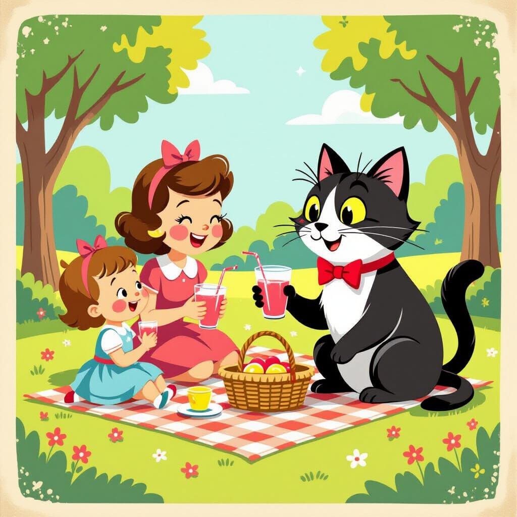 A cheerful mid-century illustration of a family enjoying a picnic, served pink lemonade by a dapper cat. Features bold lines, flat colors, and a paper texture, evoking vintage children's books.