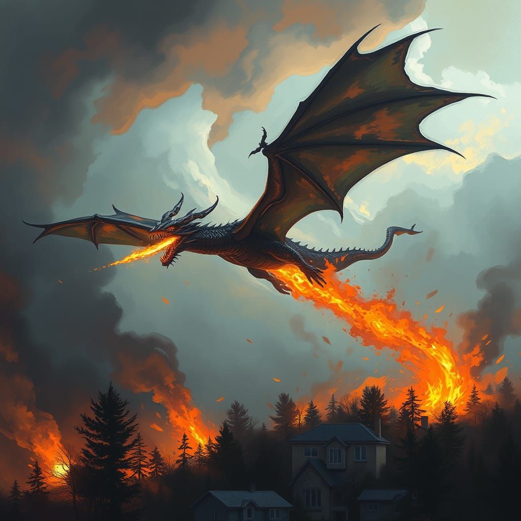 This image shows a majestic dragon soaring through the sky, breathing fire onto the landscape below. The scene evokes a fantastical, apocalyptic atmosphere with dystopian elements, expressive brushstrokes and dramatic lighting.