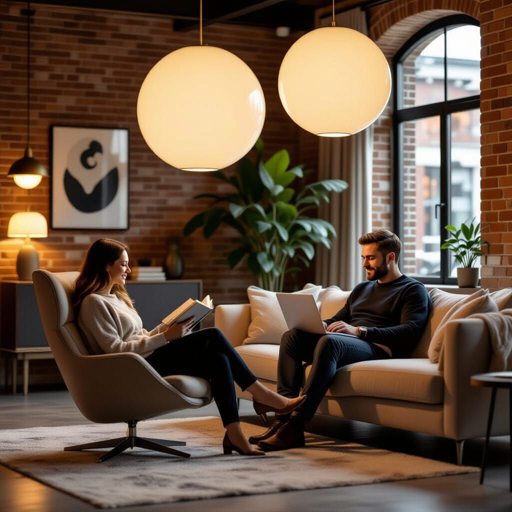 A tranquil scene of a couple in an elegant living room. Soft lighting illuminates the exposed brick, modern chair, and plush sofa in this cozy, intimate ambiance reminiscent of classic paintings.