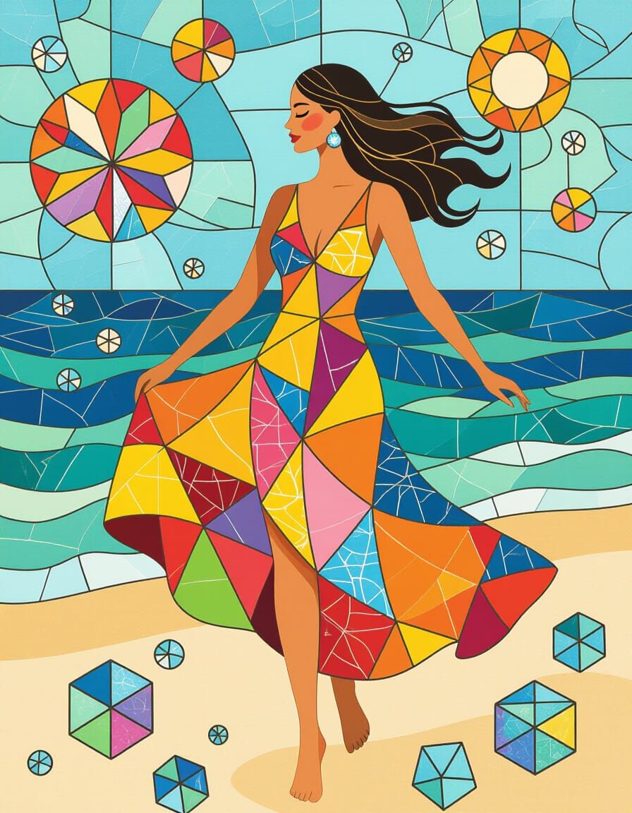 This image shows a woman on a beach in a vibrant and dreamy abstract style. The artwork features multicolored patterns, liquid bubbles and luminous iced cubes, reminiscent of stained glass.