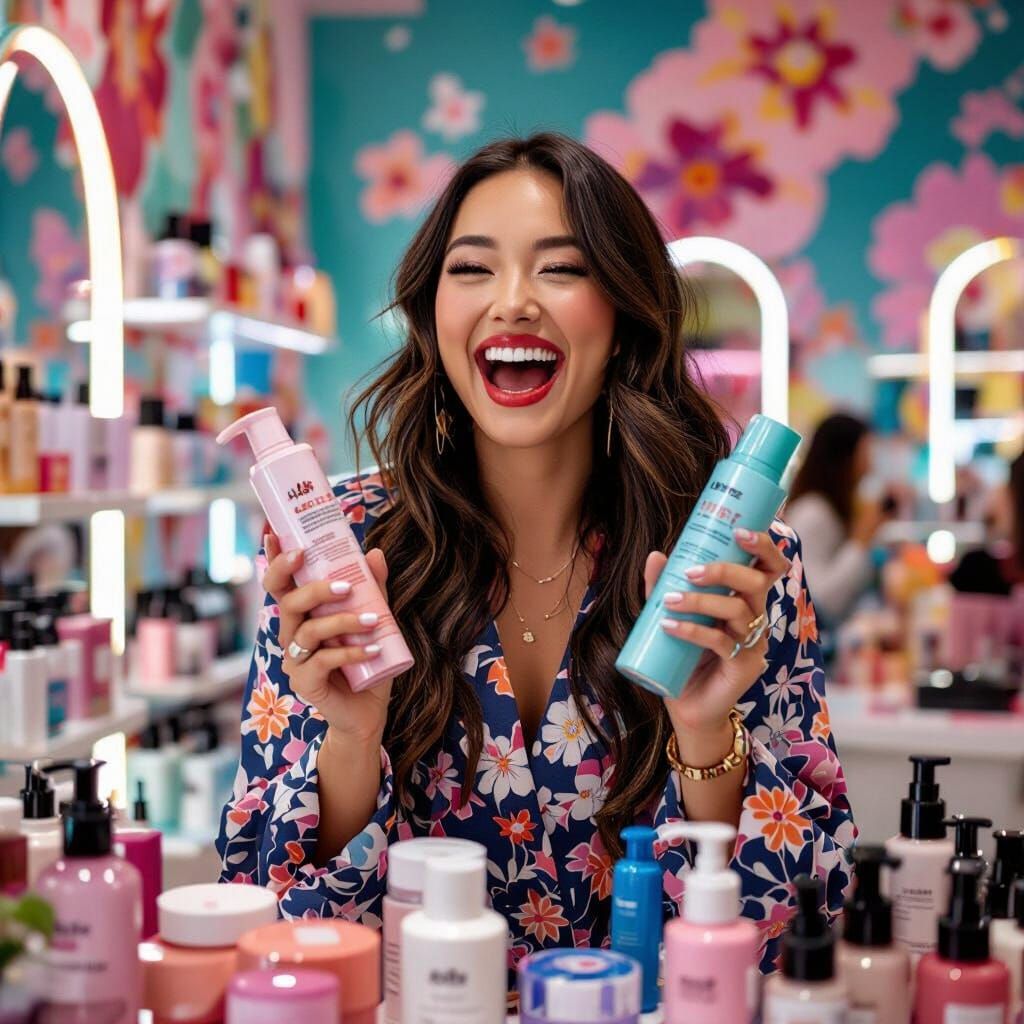 This image shows a woman excitedly shopping at a vibrant store holding hair care products. The colourful art style is reminiscent of pop surrealism and contemporary illustration.