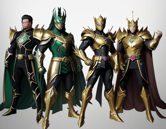 This image shows four powerful, armored heroes ready for battle. The characters are rendered with vibrant colors, gold accents and intricate textures under soft studio lighting. The scene is a dynamic, detailed concept art piece.
