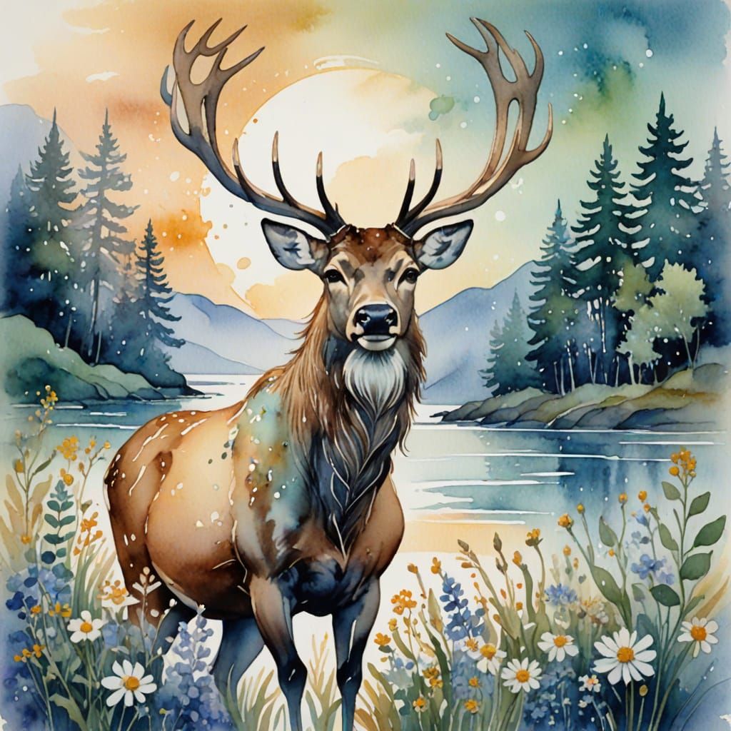 This Art Nouveau watercolor painting depicts a serene stag with wildflower-adorned antlers on a tranquil beach at dawn. Features soft, pastel colors and a dreamlike, ethereal atmosphere.