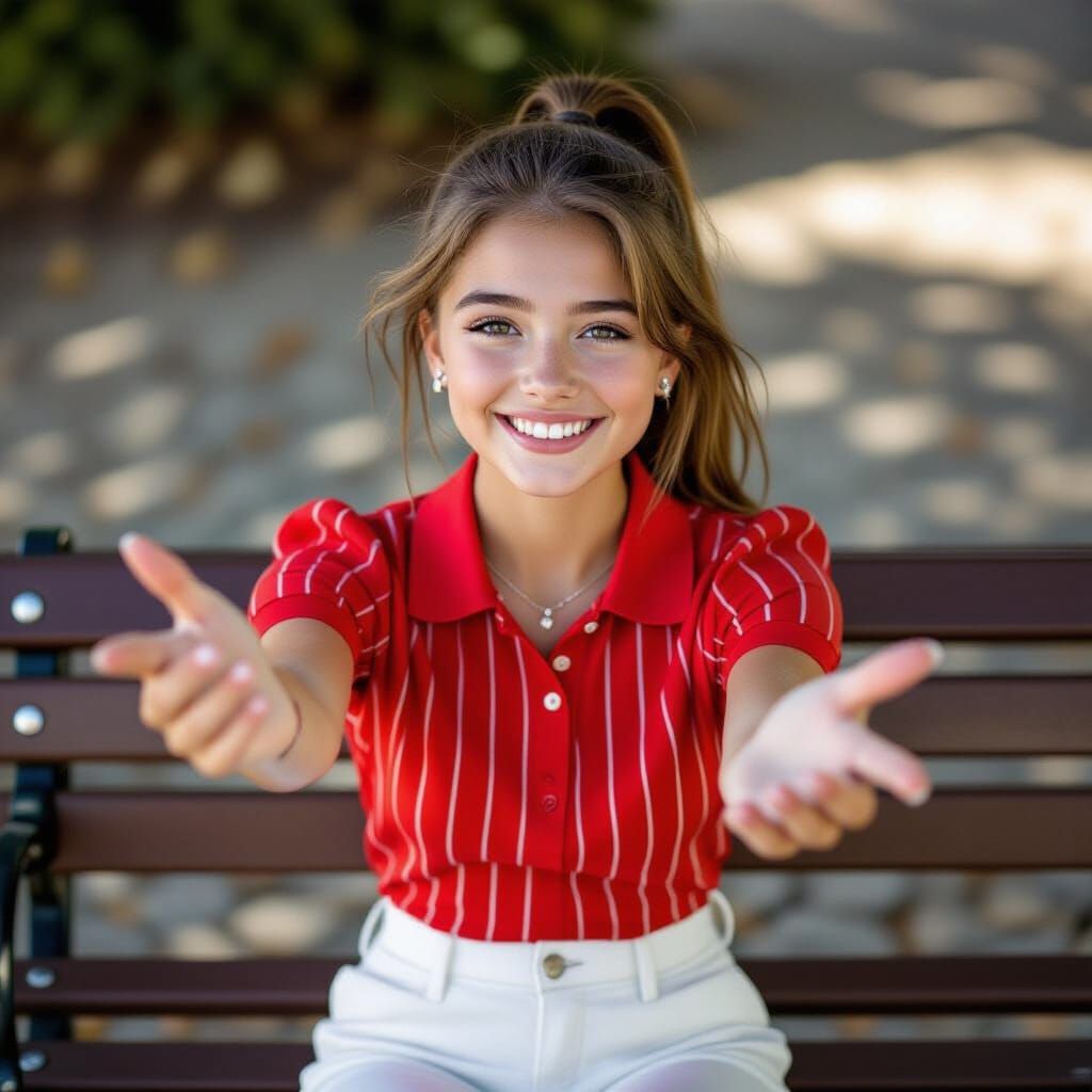This image shows a shy, preppy 16-year-old French girl with dental braces and a short ponytail, sitting on a bench and reaching for the camera with a gentle smile.