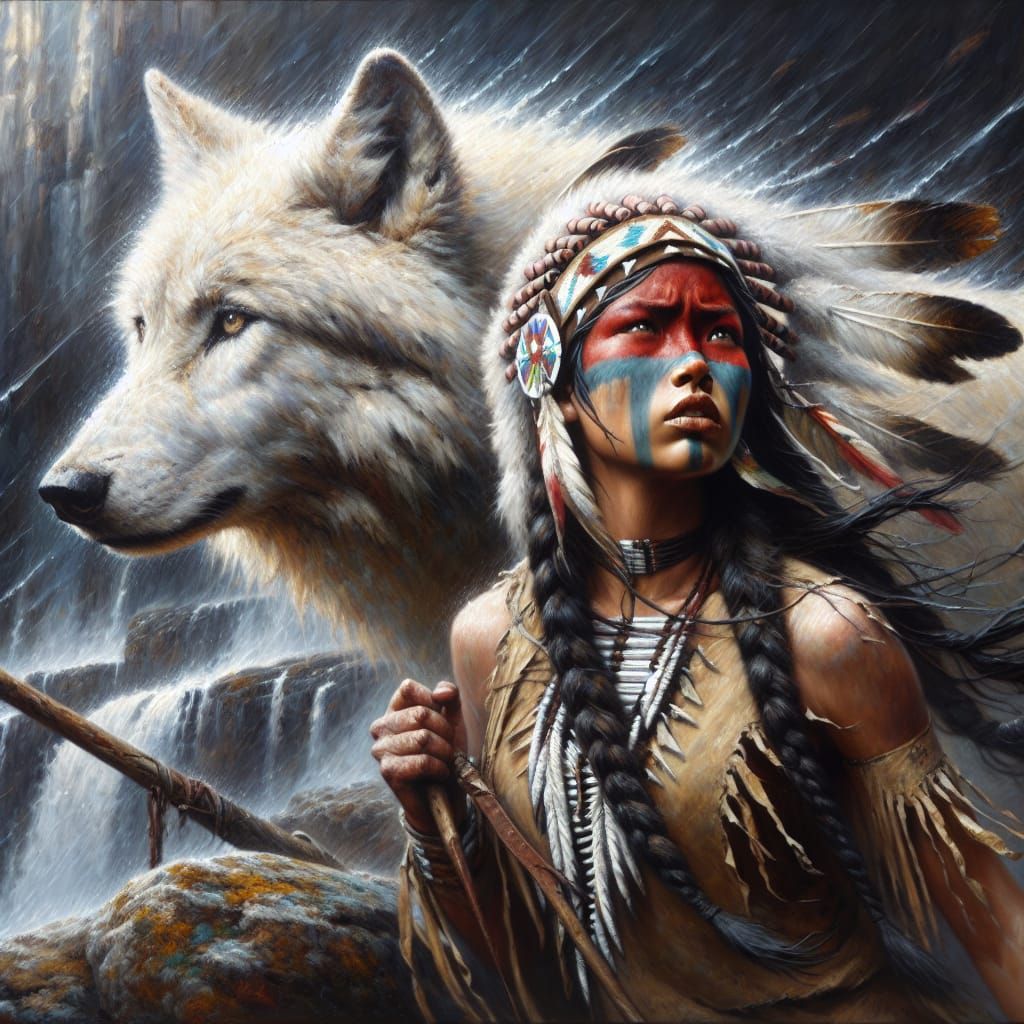 Base Prompt: Sioux girl with majestic white and gold Wolf is by her side.