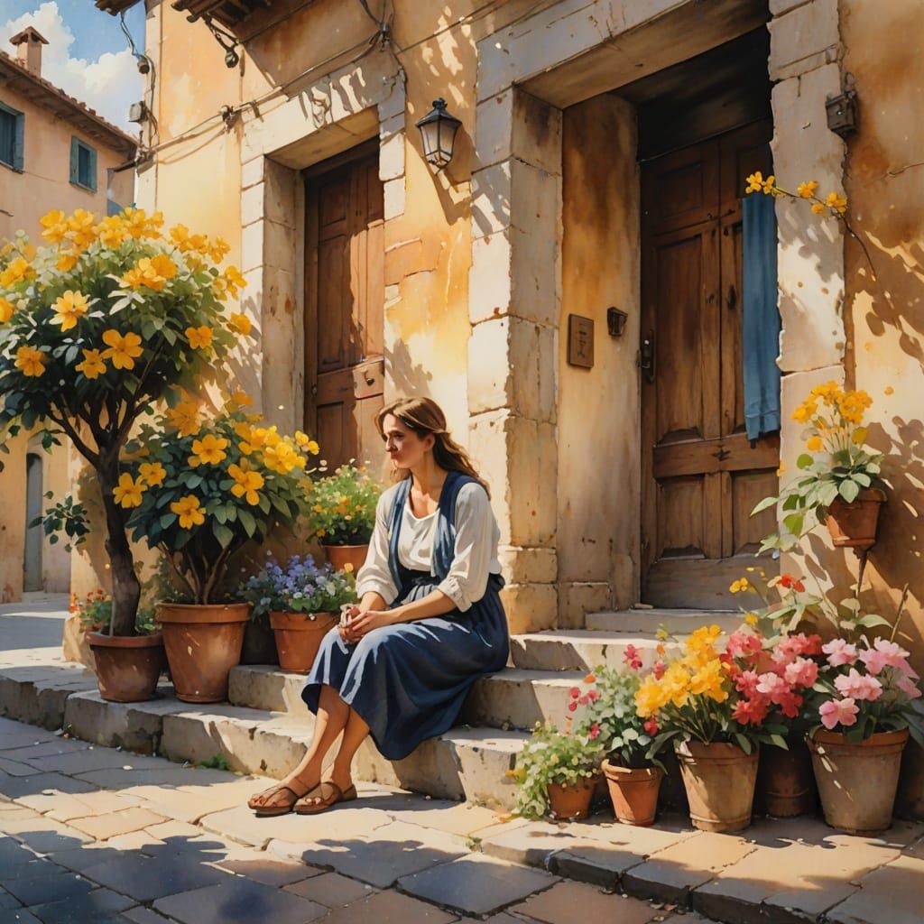 A watercolor painting of a woman seated at a flower-adorned doorstep on an old Italian street. The image evokes a soft, dreamy atmosphere with a warm, golden light and impressionistic soft brushstrokes.