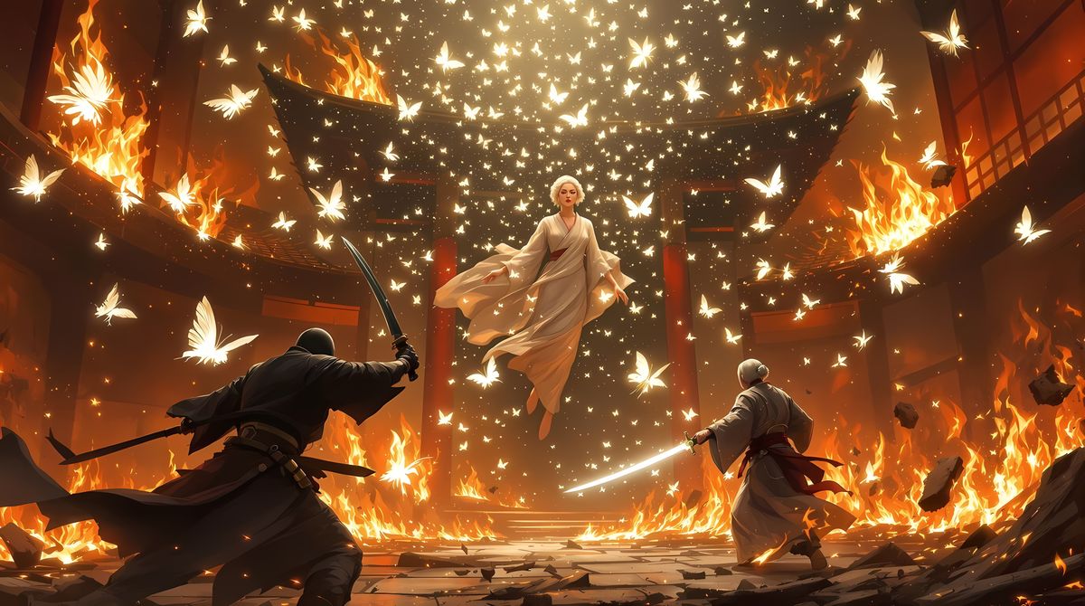This image shows a serene elderly woman amidst a chaotic scene in a burning dojo, surrounded by glowing butterflies and a focused shinobi in mid-action, amidst dramatic lighting and high contrast shadows.