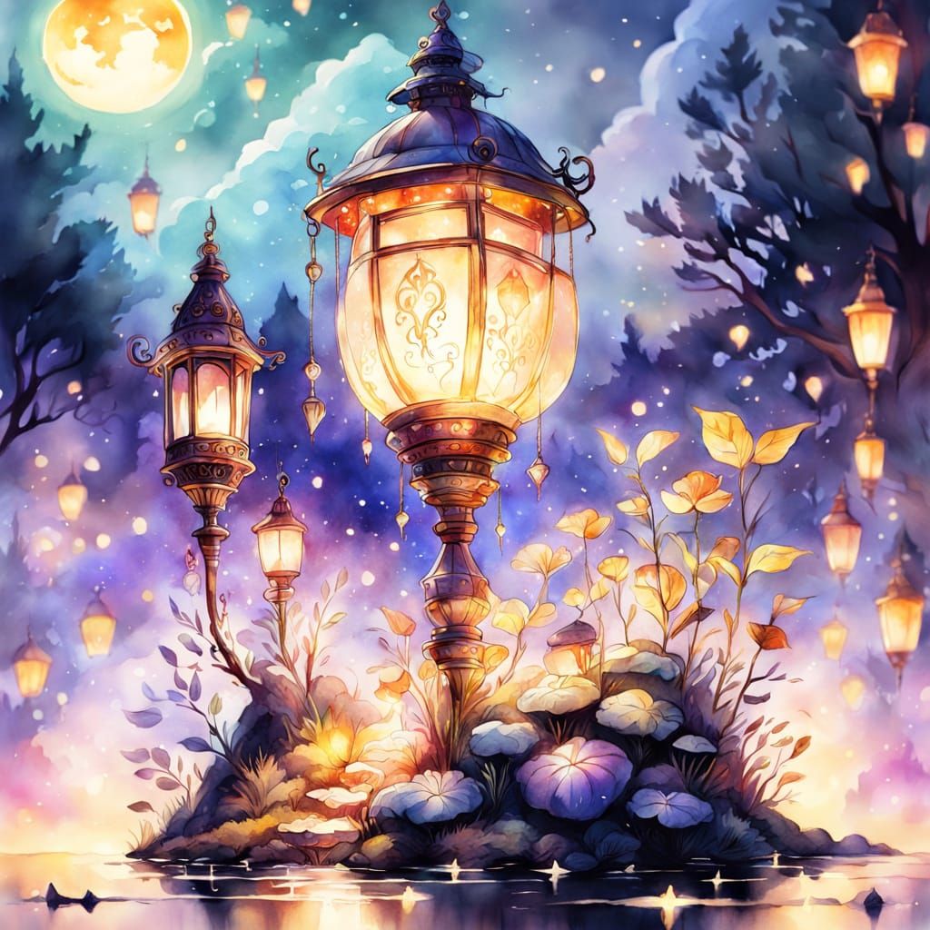 This image shows a lantern illuminating a fantasy world with soft glowing light. The artwork has a whimsical and dreamlike quality with vibrant colors, reminiscent of a watercolor sketch.