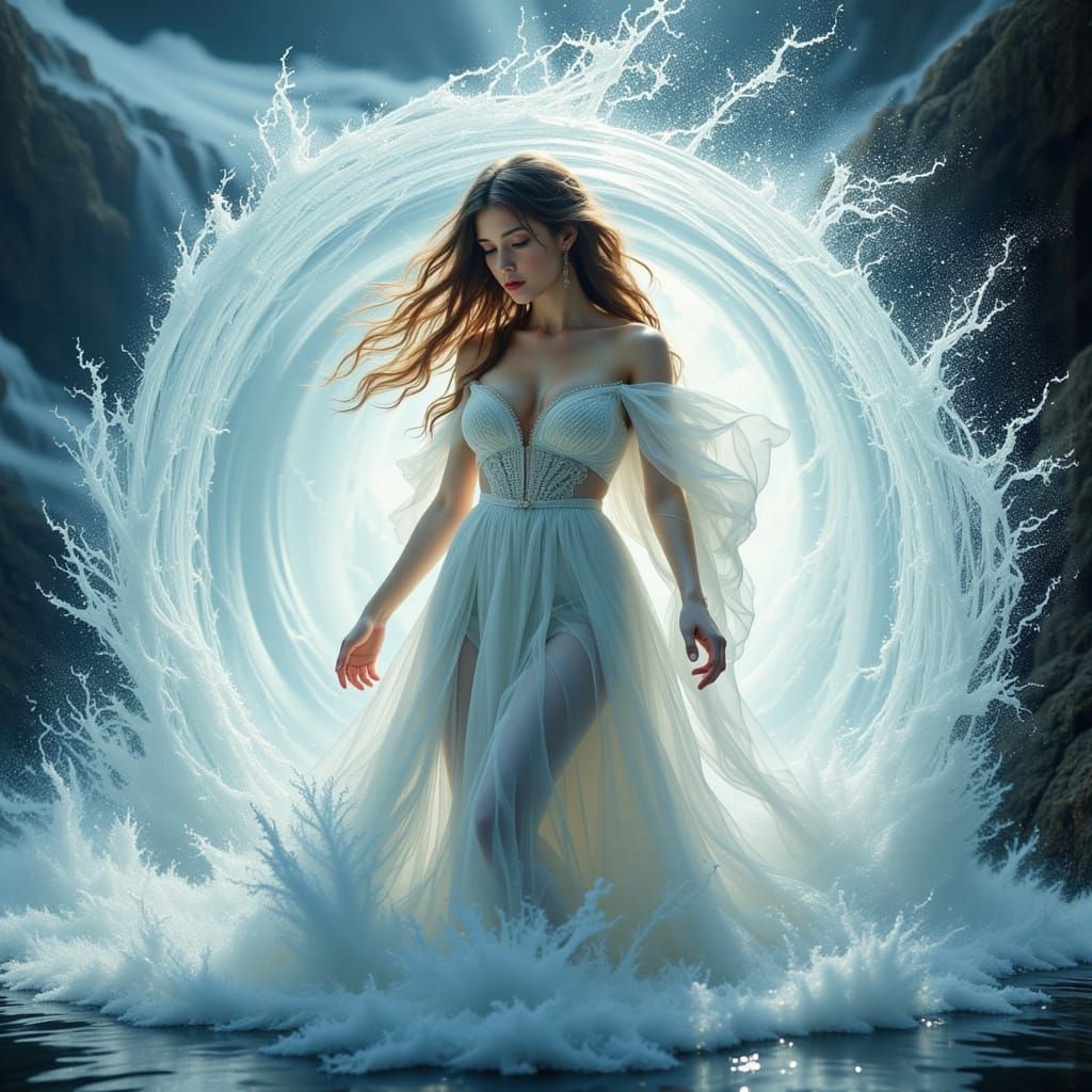This image shows a woman standing in a mesmerizing whirlpool of water spray, her hair and garments swirling around her in dynamic motion. The image is rendered in a hyper-photorealistic style with intricate details and a kaleidoscope of colors, evoking a cinematic moment with bold lighting and a subtle f...