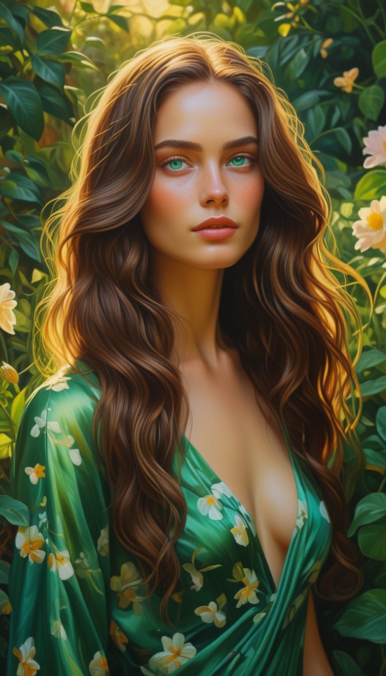 This hyper-realistic digital art depicts a beautiful woman with enchanting emerald eyes in a blooming garden, bathed in warm, golden hour light.