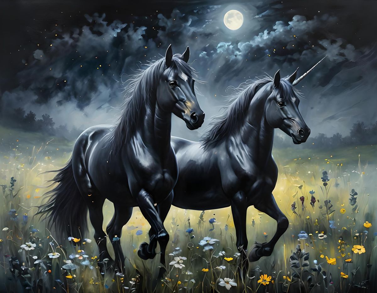 A striking picture of a black unicorn exhaling misty breath in a field. Soft pastel wildflowers are visible under moonlight, rendered as an oil painting with a dark, moody atmosphere.