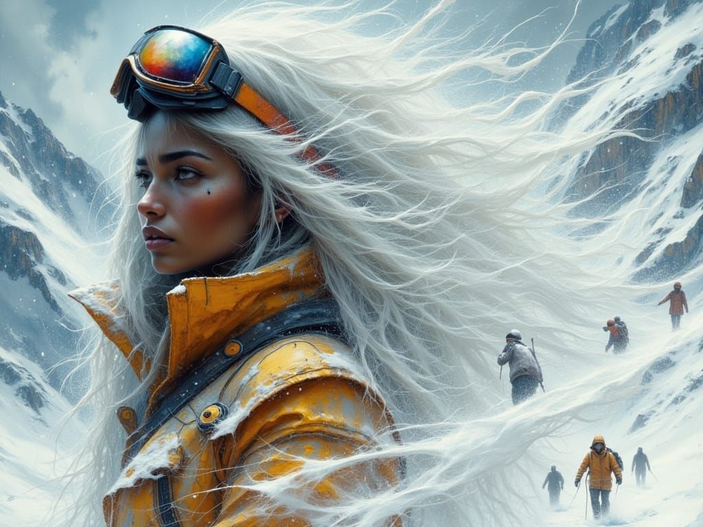 A digital painting of a dark-skinned woman with long white hair, set against a snowy scene with skiers. The artwork evokes atmospheric lighting and a blend of digital and traditional painting techniques.
