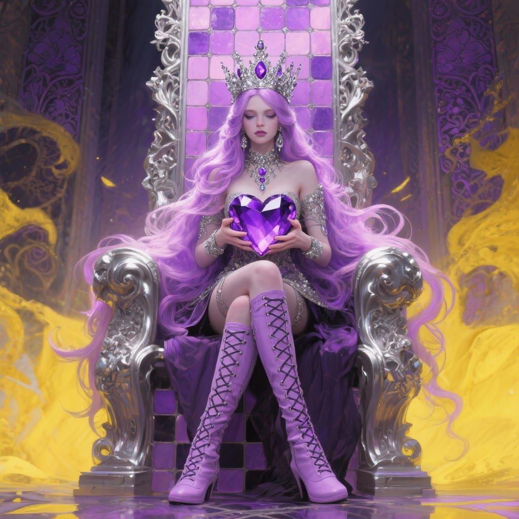 A regal Gothic woman with flowing pastel purple hair and a diamond crown sits on a throne, holding an amethyst heart. Epic cinematic digital matte painting with dramatic lighting and complementary colors.